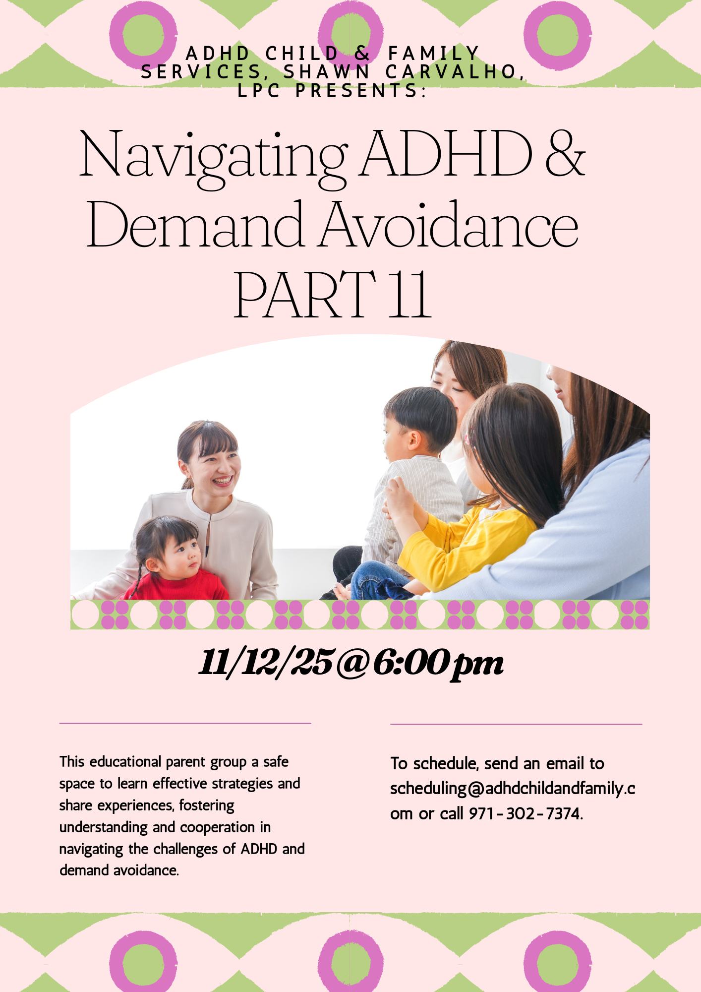 This educational Parent group is a safe space to learn effective strategies and share experiences, fostering understanding and cooperation in navigating the challenges of ADHD and demand avoidance.