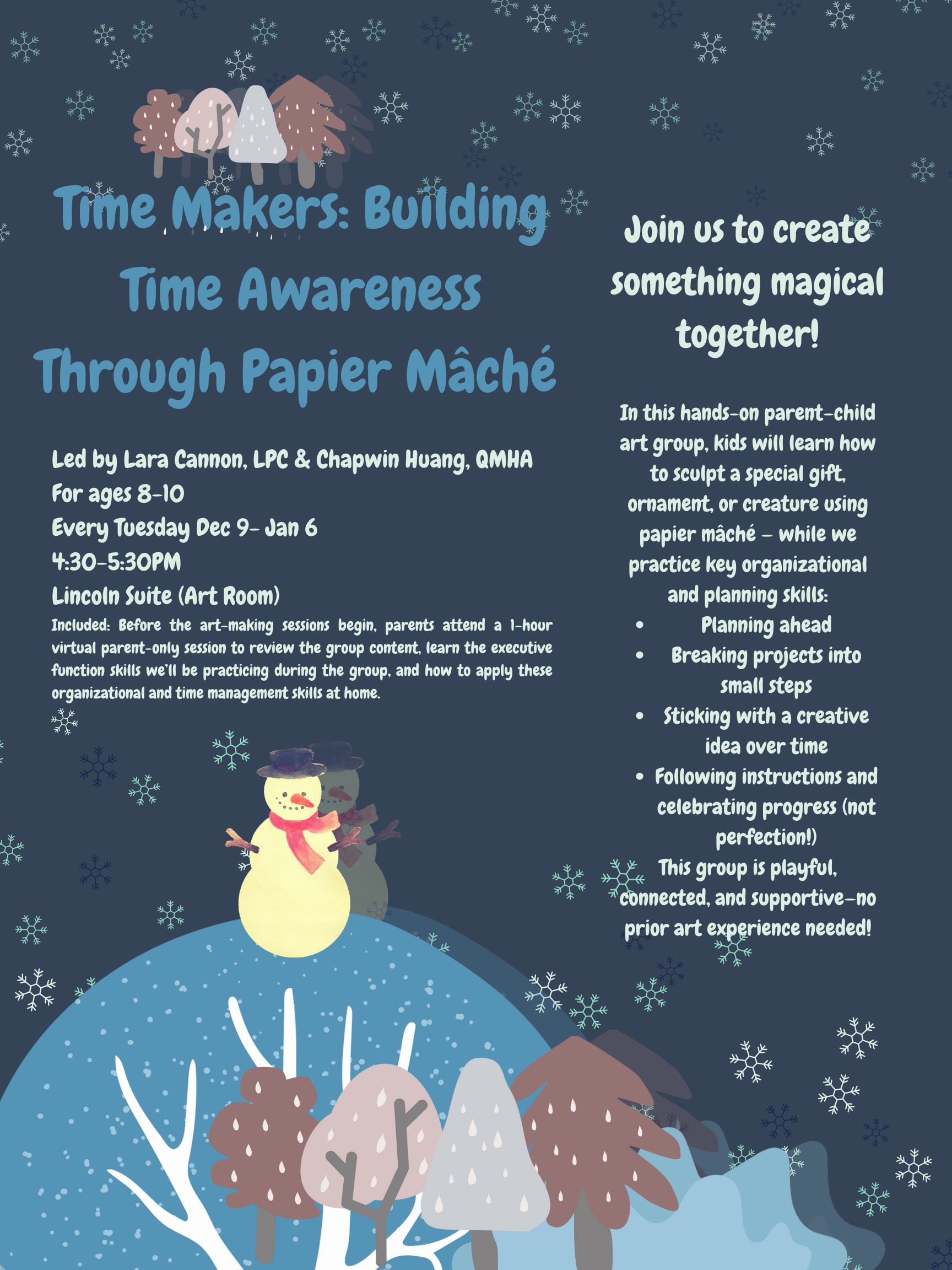 In this hands-on parent–child art group, kids will learn how to sculpt a special gift, ornament, or creature using papier mâché — while we practice key organizational and planning skills: